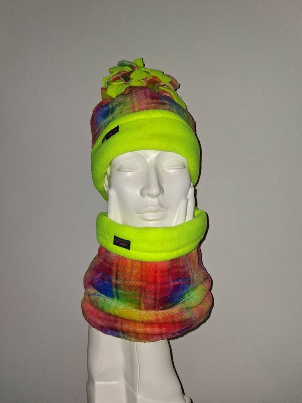 Multi-coloured fleece Hat and Neck Warmer Set.